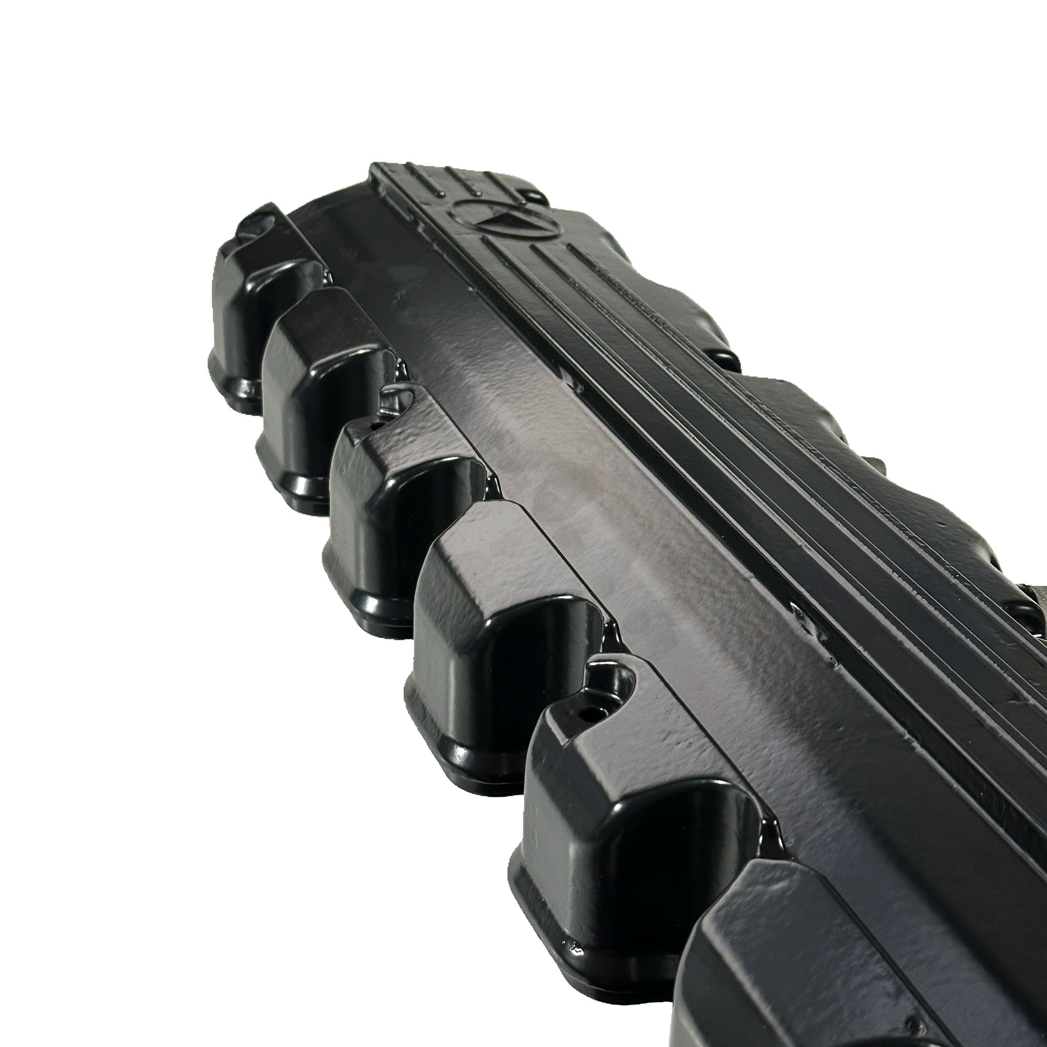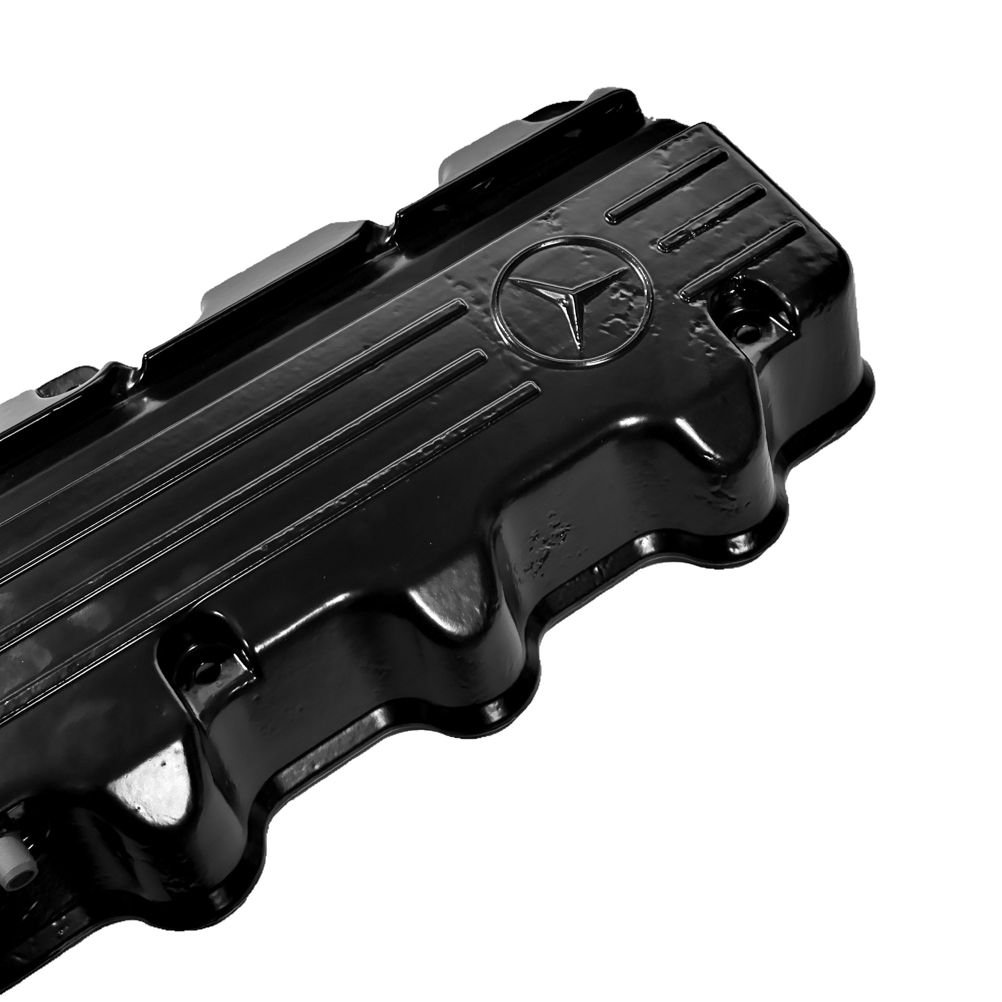 Unsere originalen Mercedes M103 Ventildeckel wurden professionell entlackt, sorgfältig geprüft und in einem edlen, widerstandsfähigen schwarzen seidenmatt-Lack pulverbeschichtet. Die Struktur-Oberfläche sorgt für eine markante Optik und zusätzlichen Schutz – ideal für Oldtimer-Enthusiasten, Tuning-Fans und alle, die Wert auf Details im Motorraum legen.